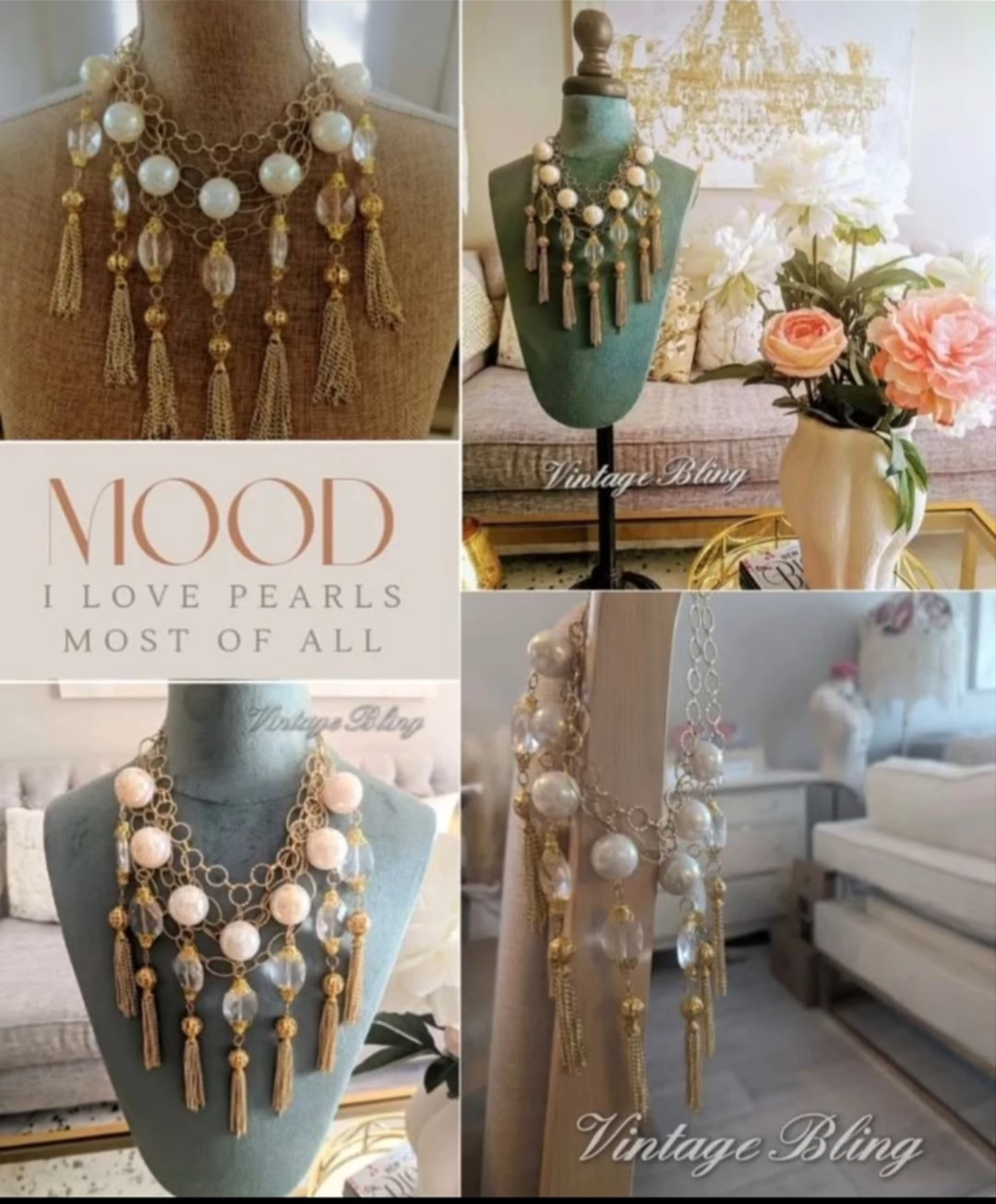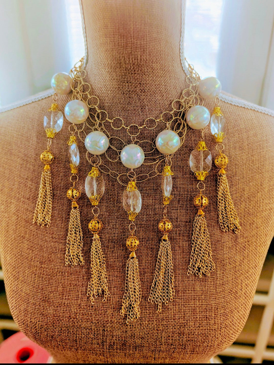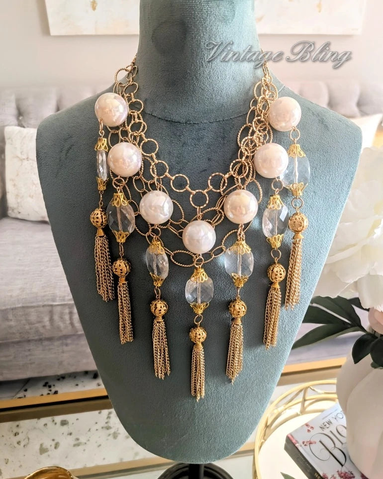 This Queen is a head-turner. You can't help but shine your shine when you wear her. All of the bobbles and tassels are vintage., as well as the incredible iridescent huge pearls. Layers of gold chain make her absolutely irresistible. In the last image, she is layered with another necklace.
